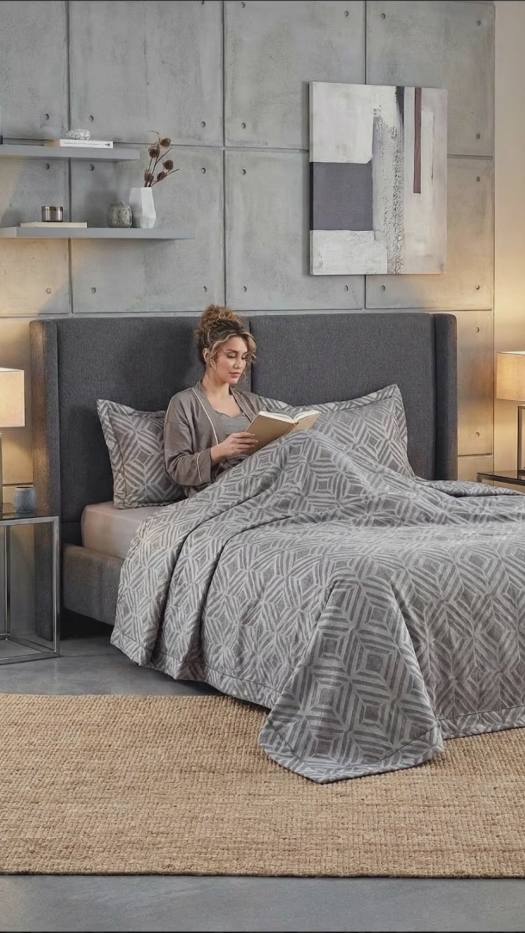 Her bir detay özenle işlenmiş geometrik desenler, odanızda sofistike bir atmosfer yaratırken, çift kişilik yatak ölçülerine uygun olarak tasarlanmıştır. Yumuşak dokusuyla konforlu bir uyku deneyimi sunar ve yatağınızı şık bir şekilde tamamlar.